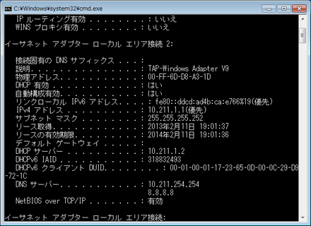 VPN 接続中は、Windows 上に仮想的な LAN カードが作成され、その仮想 LAN カードに「10.211.」で始まるプライベート IP アドレスが割当てられます。また、デフォルトゲートウェイが仮想 LAN カードに設定されます。このことを確認するためには、Windows のコマンドプロンプトから「ipconfig /all」コマンドを実行してみてください。
